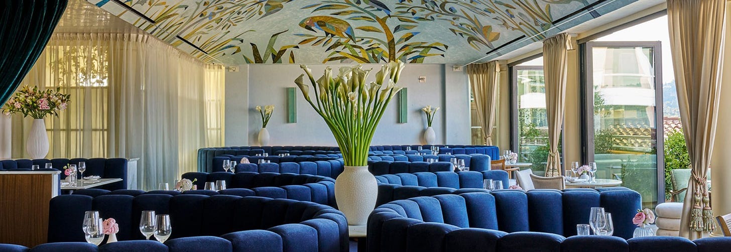 The Vibe: Amalfi-meets-SoCal, with blue velvet booths, white marble tables, and a sprawling custom fresco across the ceiling. Sweeping views of the Hollywood Hills (and the hotel’s handsome pool) complete the picture. The people-watching here is top notch: big spenders, flashy dressers, and roving entourages.
