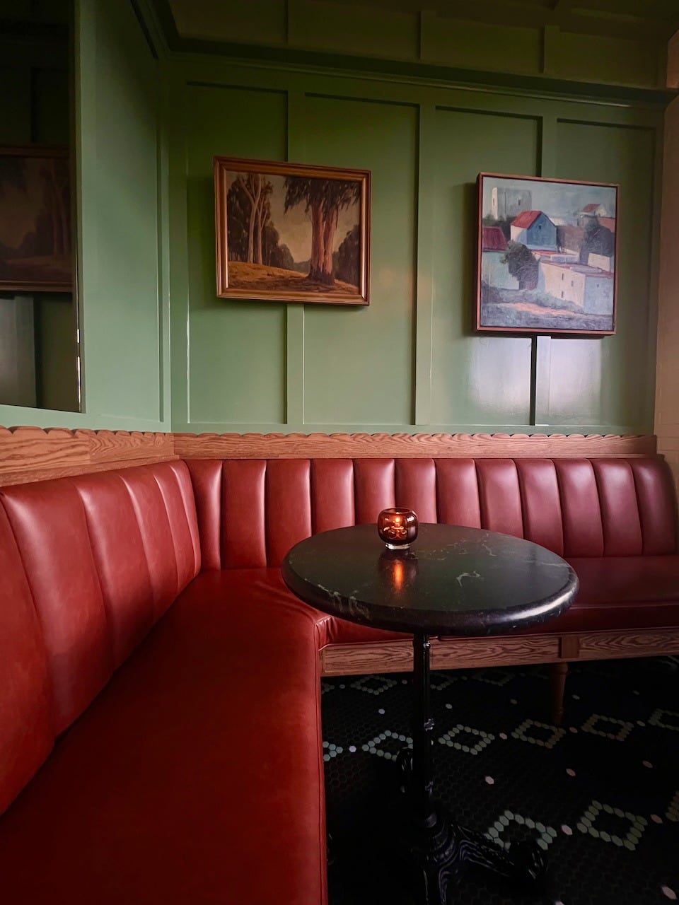 The Vibe: Vandell may be the bar of the moment, but it aspires to timelessness. An olive green exterior catches the golden hour sunlight in a pretty charming way. Inside, the bar shares the room with cognac and brick red leather booths, while a smaller room is outfitted with intimately sized round tables. Throughout, intricately tiled floors dazzle. Music that crosses genres and generations matches the mood. Employees offer warm greetings at the entrance, and service takes off speedily without any sense of rush.