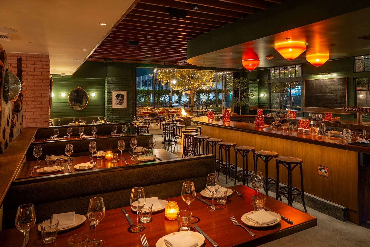 Wine refrigerators line one of the restaurant’s walls, and there are good cocktails, classic and otherwise, like the tropical Because Mother Said So with rum, lime, pineapple, coconut, and falernum. A big, central curved bar anchors the ’90s hip-hop soundtracked space, which is coated in forest green and outfitted with booths both big and small. There’s a bevy of heat lamp-adjacent patio seating as well. Service is still rounding into form, but the vibe is a welcome shift from the Disneyland-esque environs just outside.