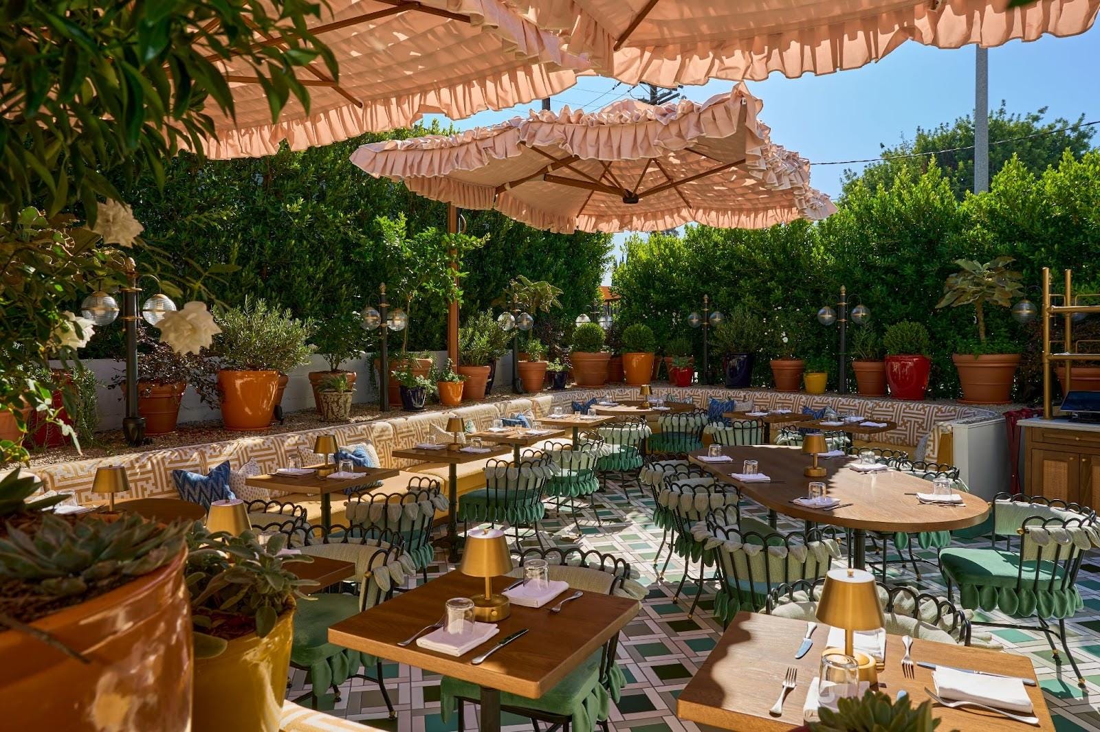 The Vibe: There’s a bar and a few tables inside, but the sprawling patio is why you’re here. With a color scheme reminiscent of the Beverly Hills Hotel, feminine touches like frilly pink umbrellas and scalloped mint green detailing on the curved dining chairs balance out a geometric tiled floor. Potted plants and fountains surround the dining area making for a welcome escape from WeHo, while a well-heeled, enthusiastic crowd gives the space a light party vibe.